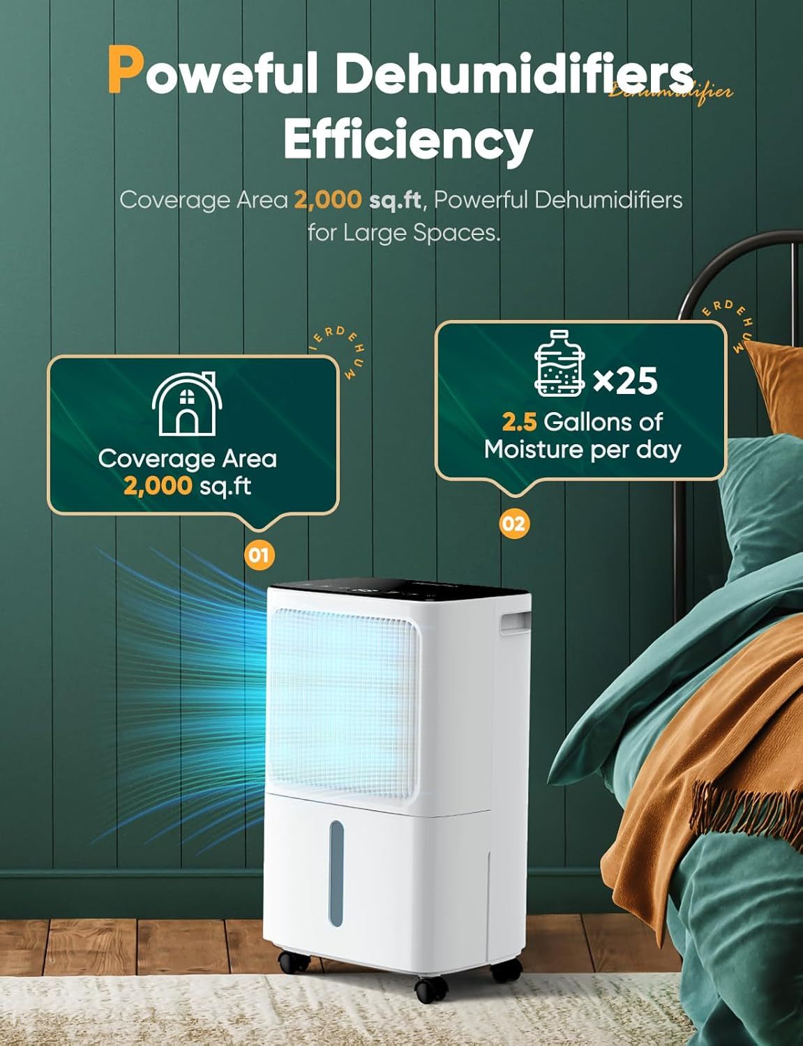- Smart Humidity Control: With easy-to-use digital controls and a clear LED display, adjusting humidity levels and settings is a breeze. The dehumidifier continuously monitors indoor humidity levels, adapting its operation to maintain an ideal comfort zone