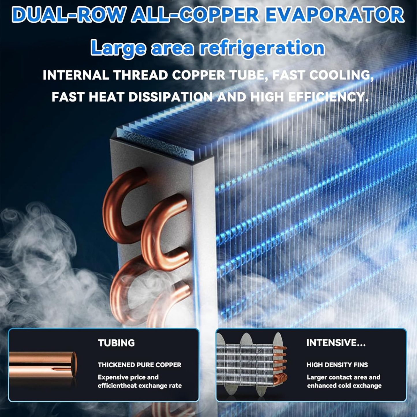 Compressor + water evaporation double cooling, the heat generated by the compressor is transferred to the water, the water evaporates and absorbs heat, there is no hot air and no heat discharge pipe is needed.