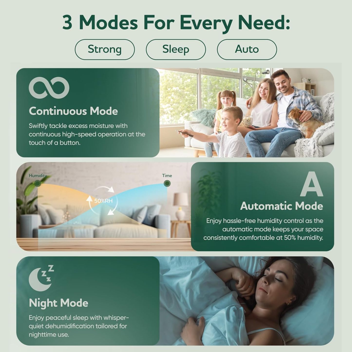 - 3 Working Modes: This bedroom dehumidifier offers versatile features with three different working modes: Strong mode for maximum dehumidification efficiency, sleep mode for quieter operation suitable for use in the bedroom and automatic mode which ensures continuous dehumidification until reaching about 50% RH